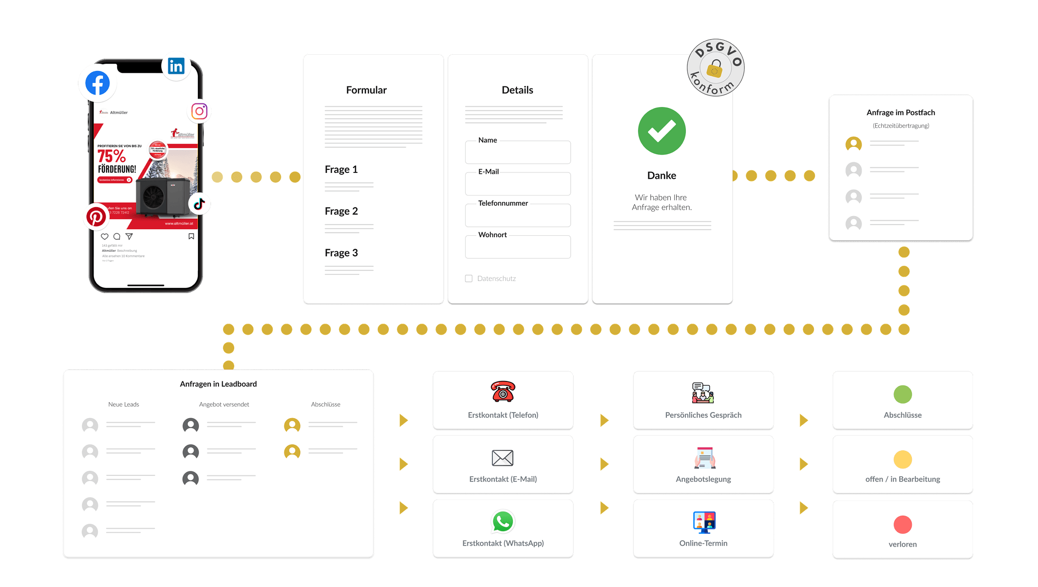 Eine digitale Anfrage ohne konsequente Nachbearbeitung ist wertlos! Ein Lead-System muss stets in das Vertriebssystem integriert und der gesamte Neukundenprozess abgebildet werden. Nur so gelingt die notwendige Neukunden- oder Mitarbeitergewinnung.